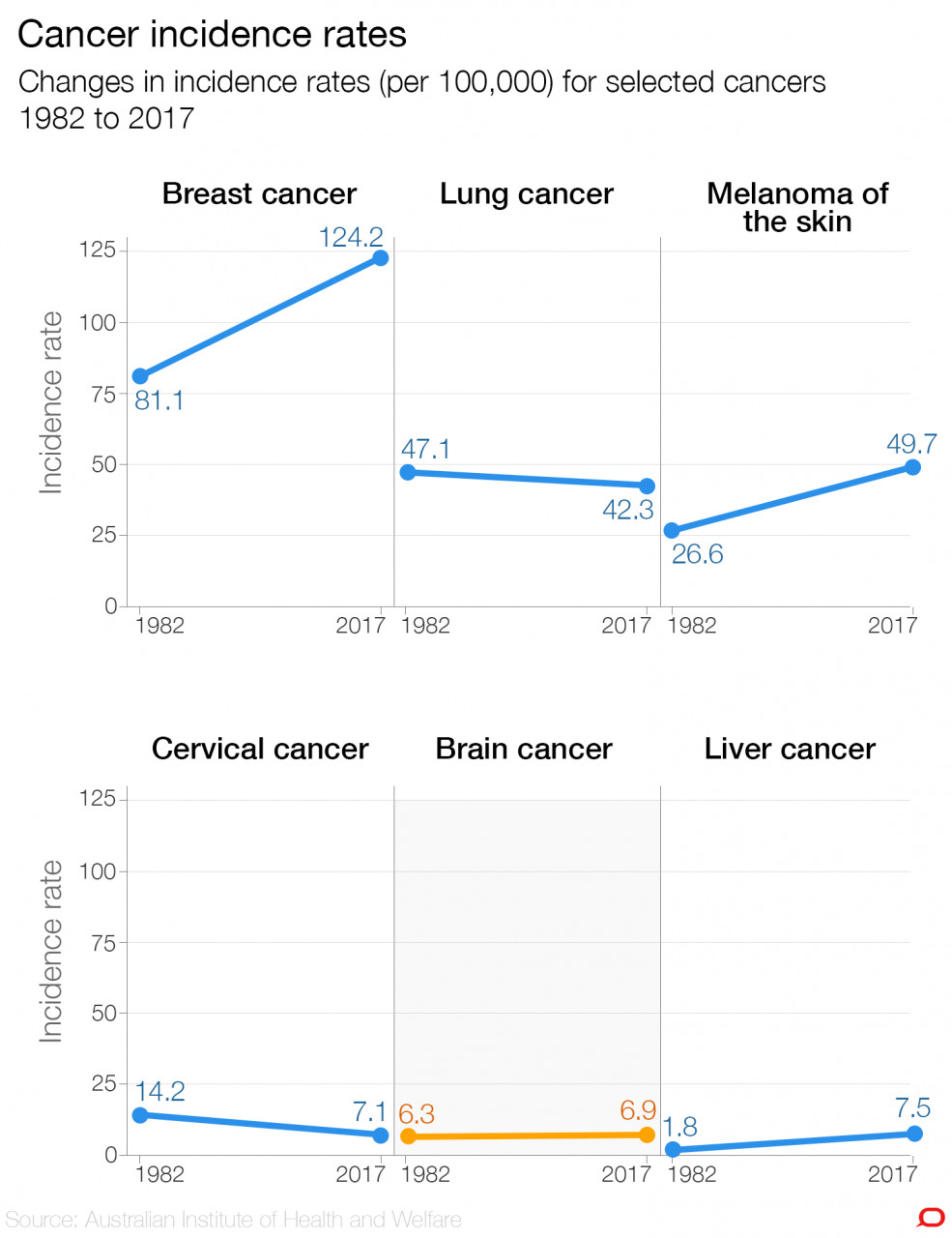 Incidence rates for brain and CNS cancers have stayed steady for some decades but the sickness and death that comes with the disease continues to affect many Australian lives. A recent report from the Australian Institute of Health and Welfare shows that the incidence of many cancers has increased over time.