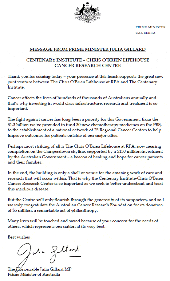 Prime Minister Julia Gillard has generously recognised the vision of the ACRF in seed-funding this state-of-the-art cancer facility. She states:
